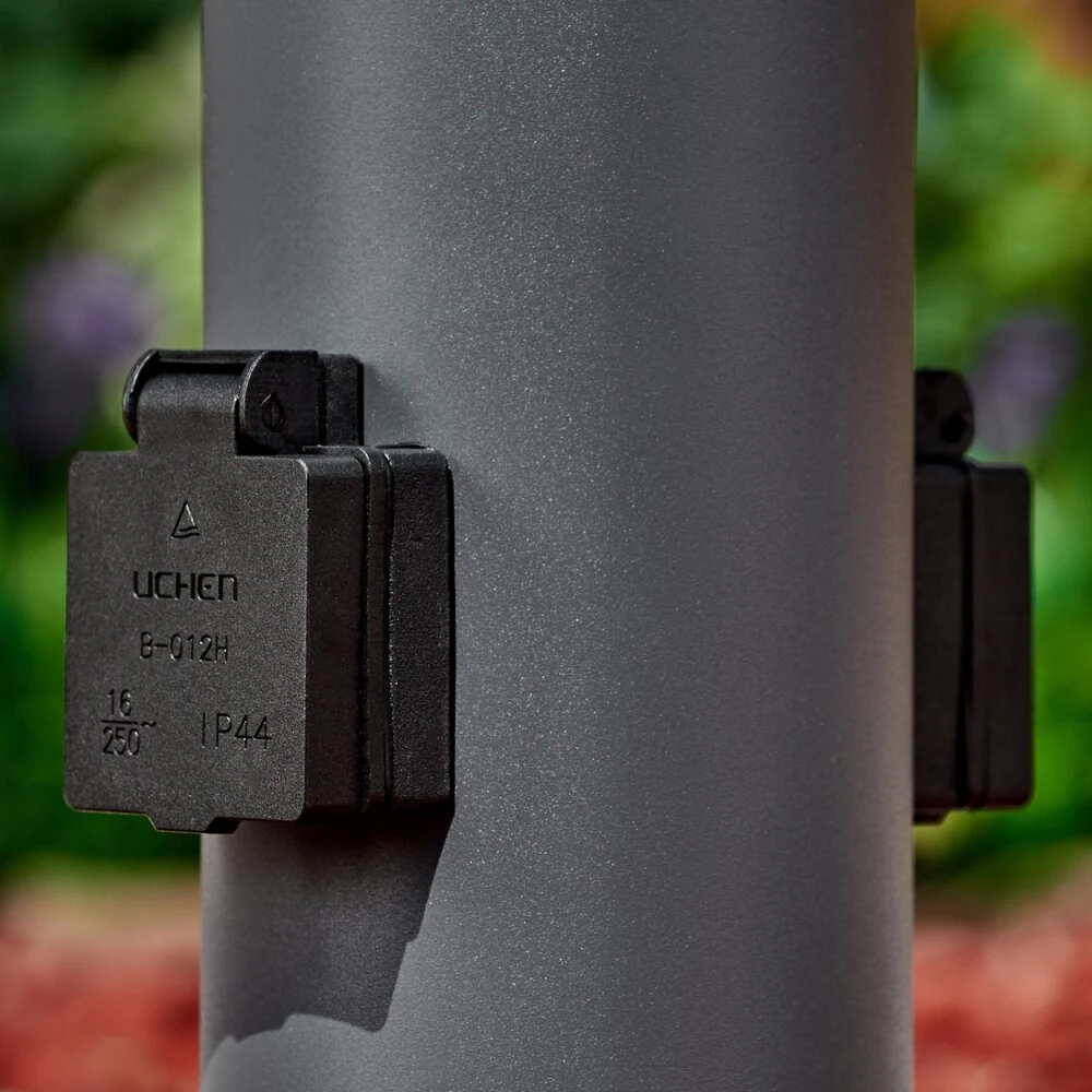 In dieser Leuchte sind zwei Steckdosen mit Schutzabdeckung integriert.