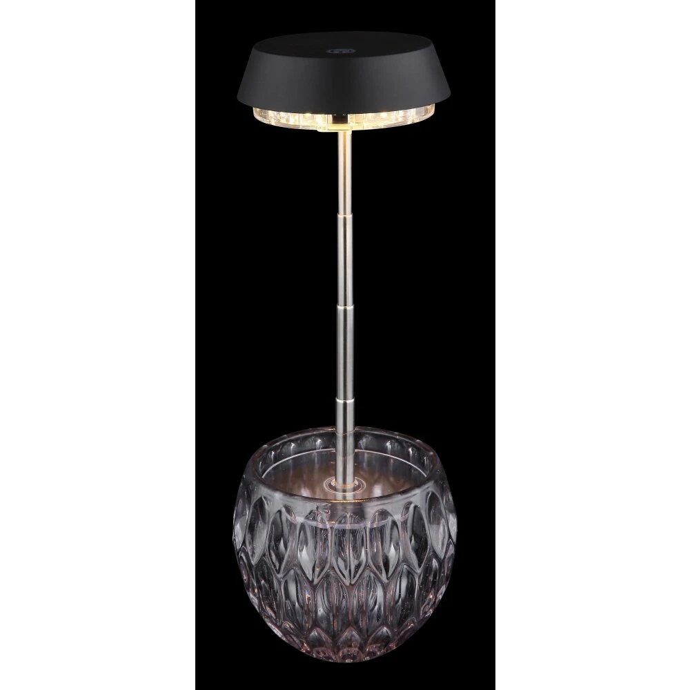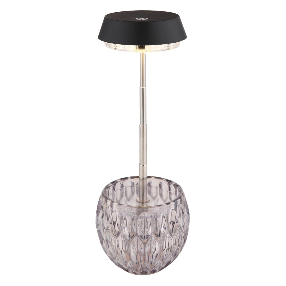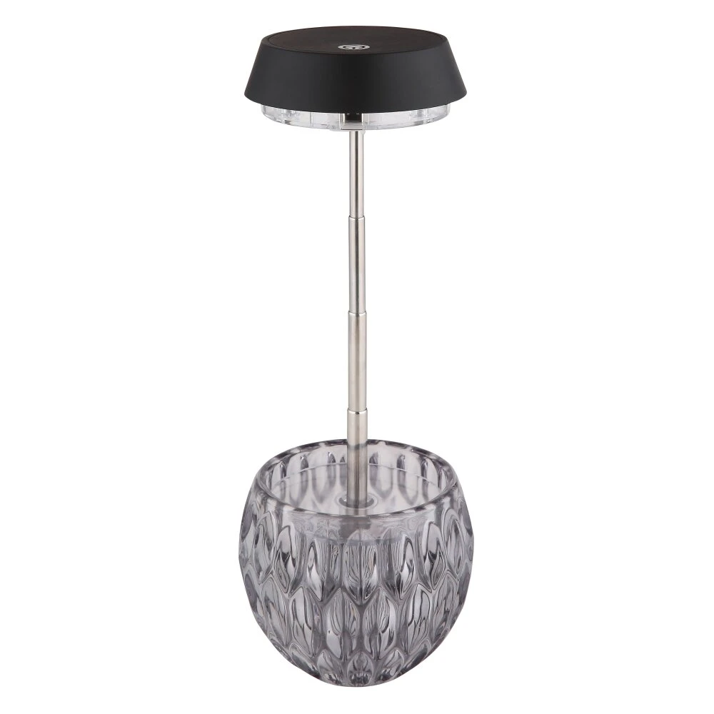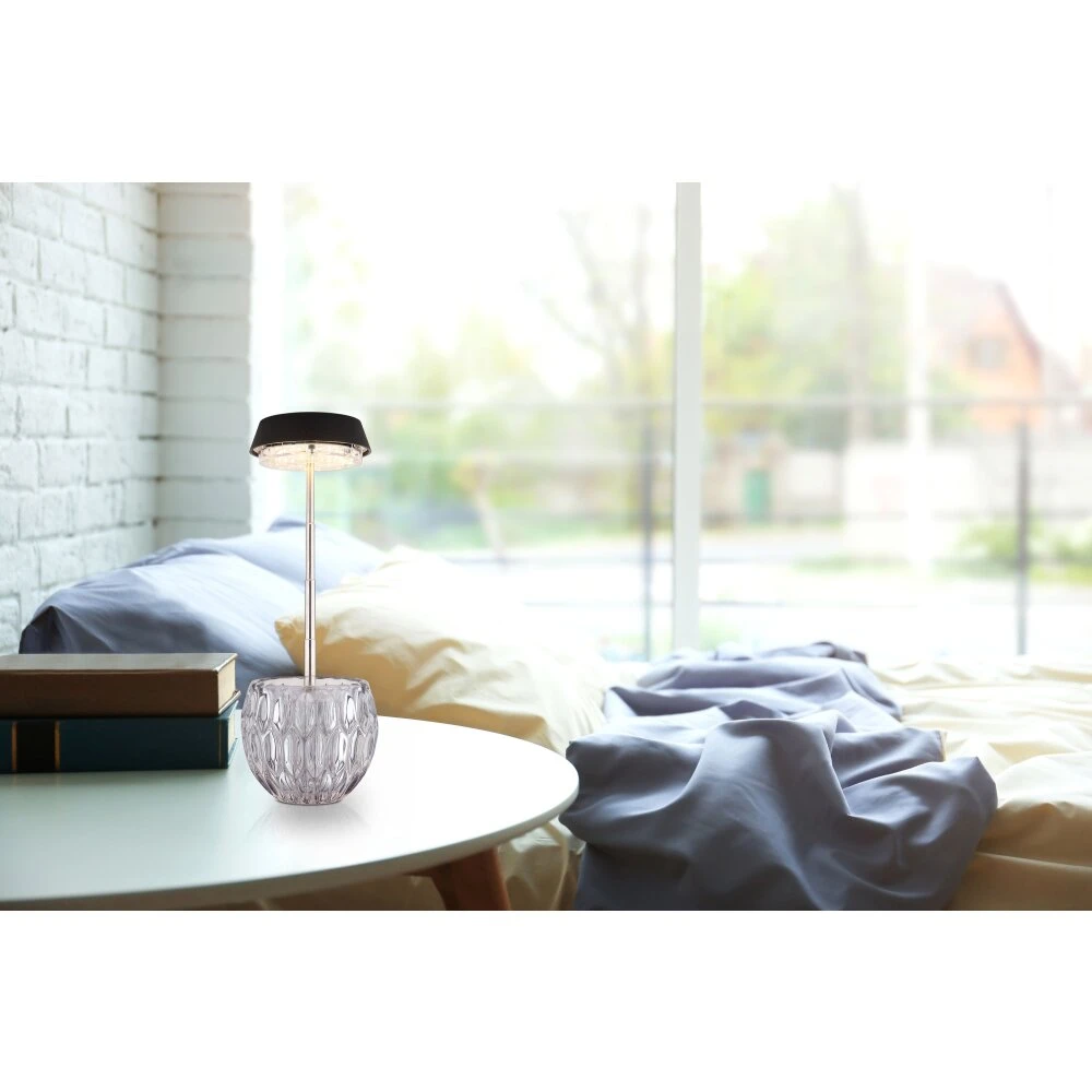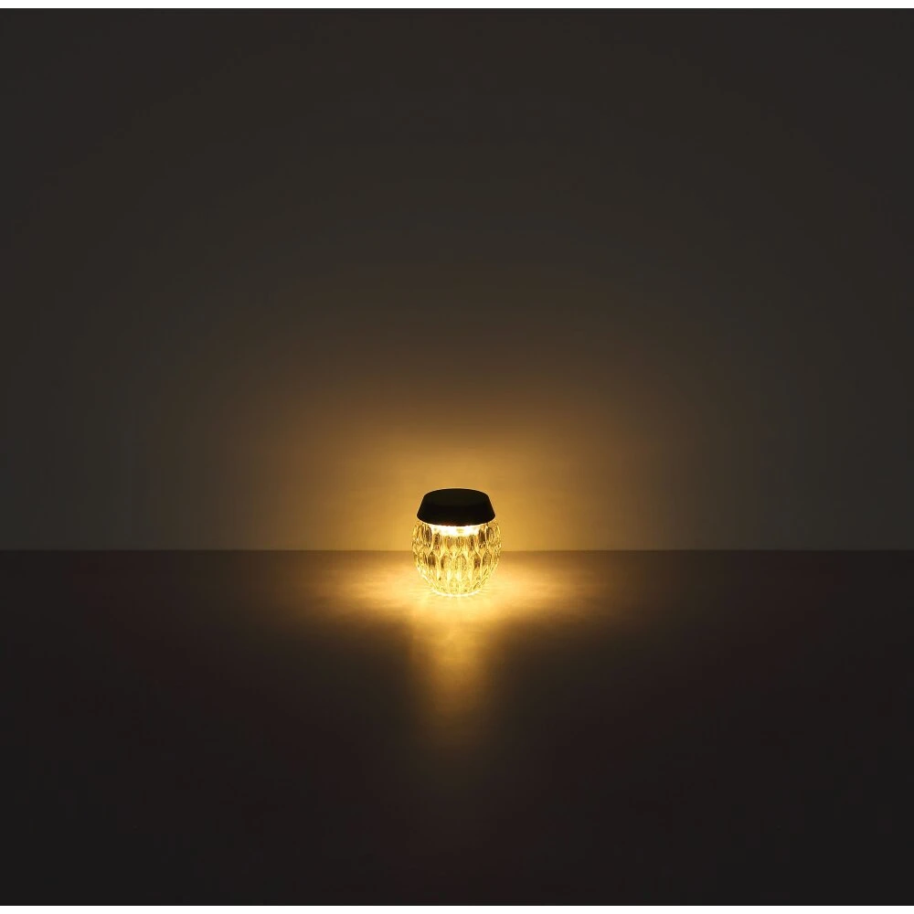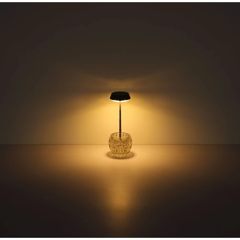 - Die Tischleuchte WANDA kombiniert modernes Design mit praktischen Funktionen. Ihr runder Korpus aus rauchfarbenem Glas mit einem Sockel in Kristalloptik aus Edelstahl verleiht ihr einen eleganten Look. Der Schirm besteht aus mattem schwarzen Kunststoff und klarem Kunststoff für eine gleichmäßige Lichtverteilung im Raum. Ein integrierter Touchdimmer ermöglicht es, die Helligkeit der 55 Lumen bei einer angenehmen Farbtemperatur von 3000 K stufenlos anzupassen. Besonders praktisch ist das Teleskop, mit dem die Höhe der Leuchte individuell angepasst werden kann. Die WANDA Tischleuchte wird komplett mit Adapter und USB-Ladekabel geliefert. Die Aufladezeit beträgt etwa 4 Stunden, währenddessen die Leuchte auch im Betrieb genutzt werden kann. Nach vollständigem Aufladen bietet sie eine Leuchtdauer von ca. 6 Stunden. Diese Tischleuchte ist ideal für moderne Wohnbereiche und schafft mit ihrem warmen Licht und dem ansprechenden Design eine gemütliche Atmosphäre.