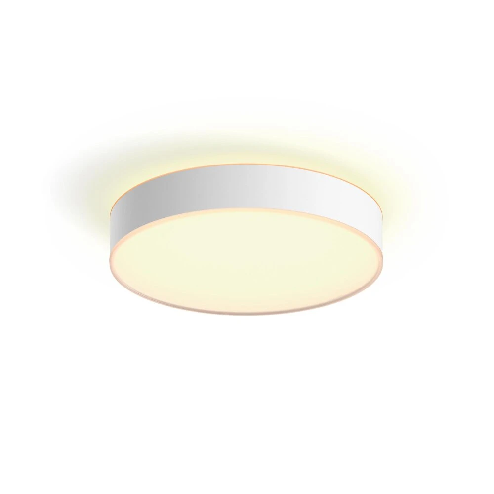 - Die Philips Hue Enrave Deckenleuchte ist eine weiße Deckenleuchte (Durchmesser 38cm), die in jedes moderne Interieur passt. Die White Ambiance LED-Leuchte hat ein elegantes Design und bietet mit 50.000 Weißtönen das richtige Licht für jede Gelegenheit. Setze am Morgen eine schöne, helle Farbe, damit du den ganzen Tag effektiv und konzentriert arbeiten kannst. Abends wählst du einen warmweißen Farbton für eine gemütliche, entspannte Atmosphäre. Steuere dieses smarte Licht ganz einfach über Bluetooth und die Hue App. Telefon nicht zur Hand? Kein Problem, in der Box findest du auch einen Philips Hue Dimmschalter. Du kannst den Dimmschalter aufhängen, wo immer du willst, oder ihn als Fernbedienung benutzen. Mit einem Knopfdruck kannst du die Enrave zwischen verschiedenen Lichtrezepten umschalten, oder sie einfach ein- oder ausschalten, dimmen oder aufhellen. Möchtest du alle smarten Funktionen von Philips Hue nutzen? Füge dann eine Philips Hue Bridge hinzu und schalte Timer, Automatisierungen und Außensteuerungen frei.